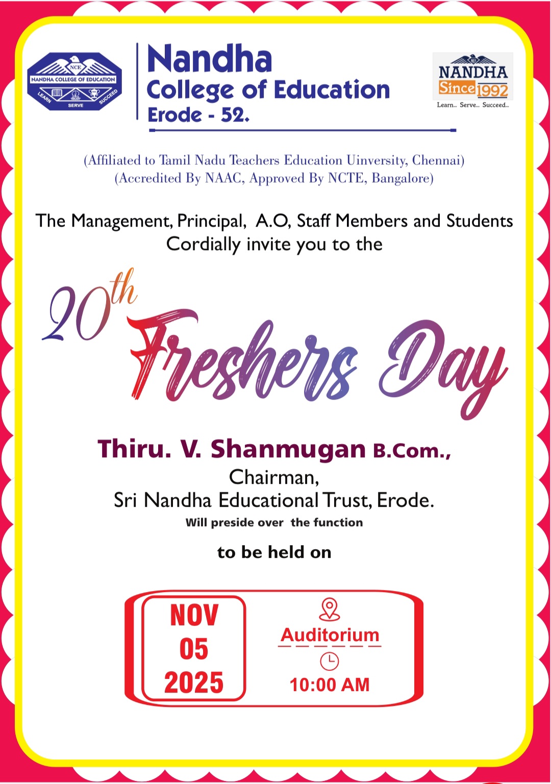 Nandha College of Education was started by Thiru.V. Shanmugan B.Com., Chairman cum Managing Trustee during the year 2006. This was started with the aim to impart quality Teacher education which focuses on the rural population, belongs to various caste, creed and religion. Success starts with a thought or an idea when nourished with hope and confidence, that idea sprouts, blossoms Nandha College of Education is a creation to impart and provide such a knowledge which is strength and power to the society with the learning of the latest developments of the world to meet the growing demand for trained man power.